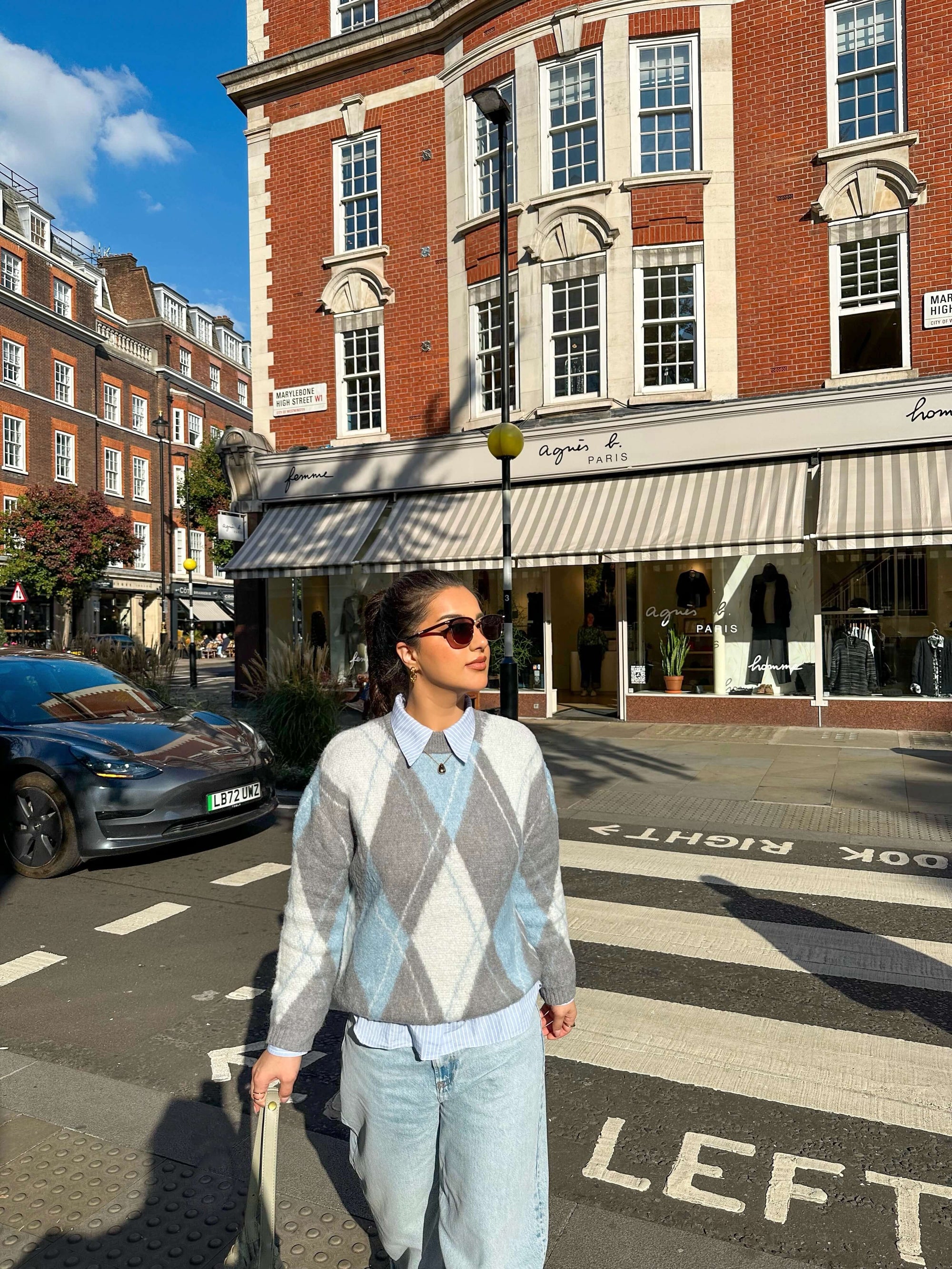 The preppy sweater that fits geometric aesthetics enhances intellectual connotation. It is a collision of light gray-blue tones and argyle elements. The coordination and fusion of three colors present a multi-layered, comfortable visual sense. The texture is soft and cozy, without any constraints, making you feel as light and free as if you were on a cloud.