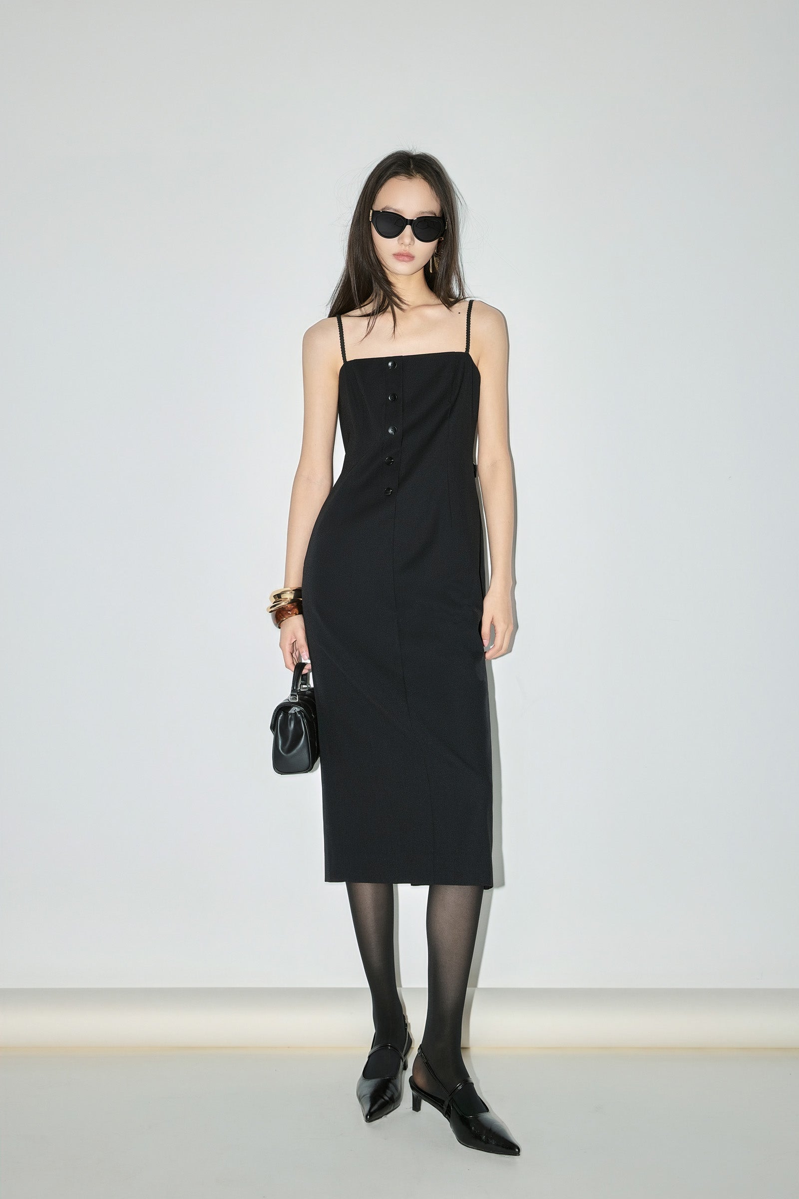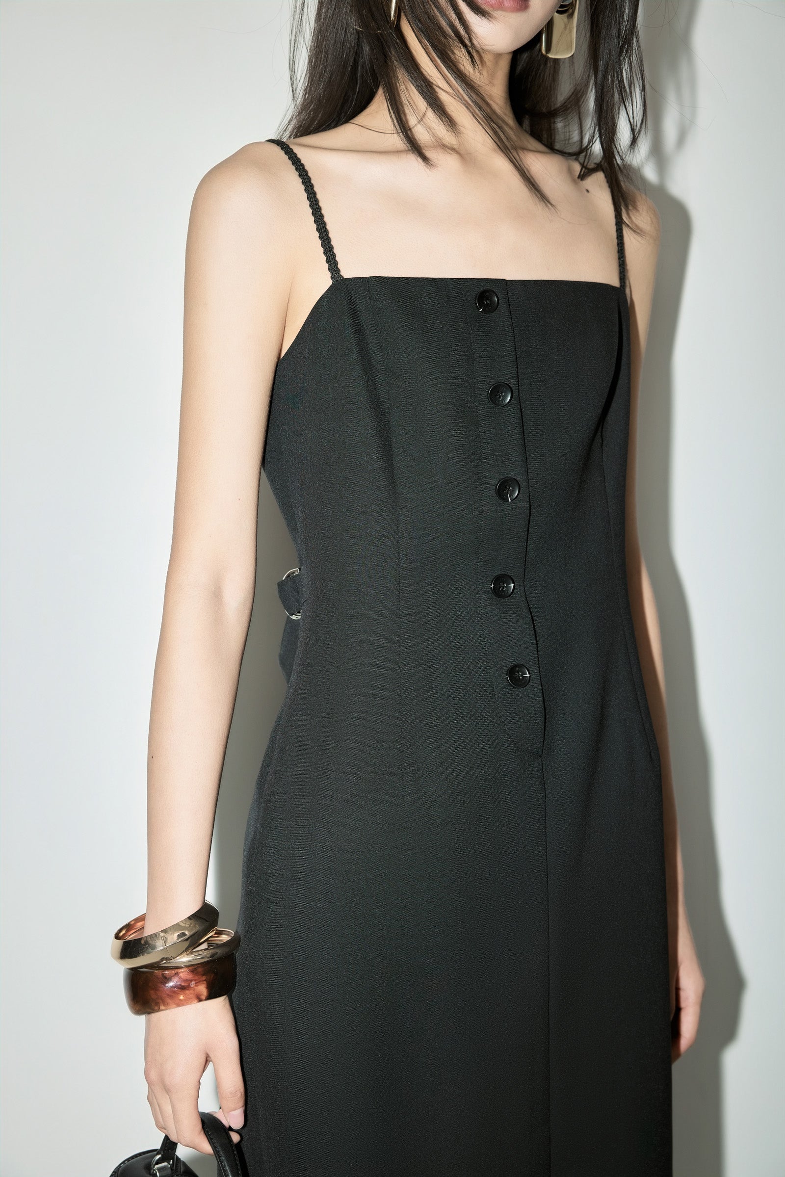 meteorite black Long sling, slim fit, adjustable waist, Finished woven shoulder straps, decorative fly buttons, adjustable waist buckle, center back
