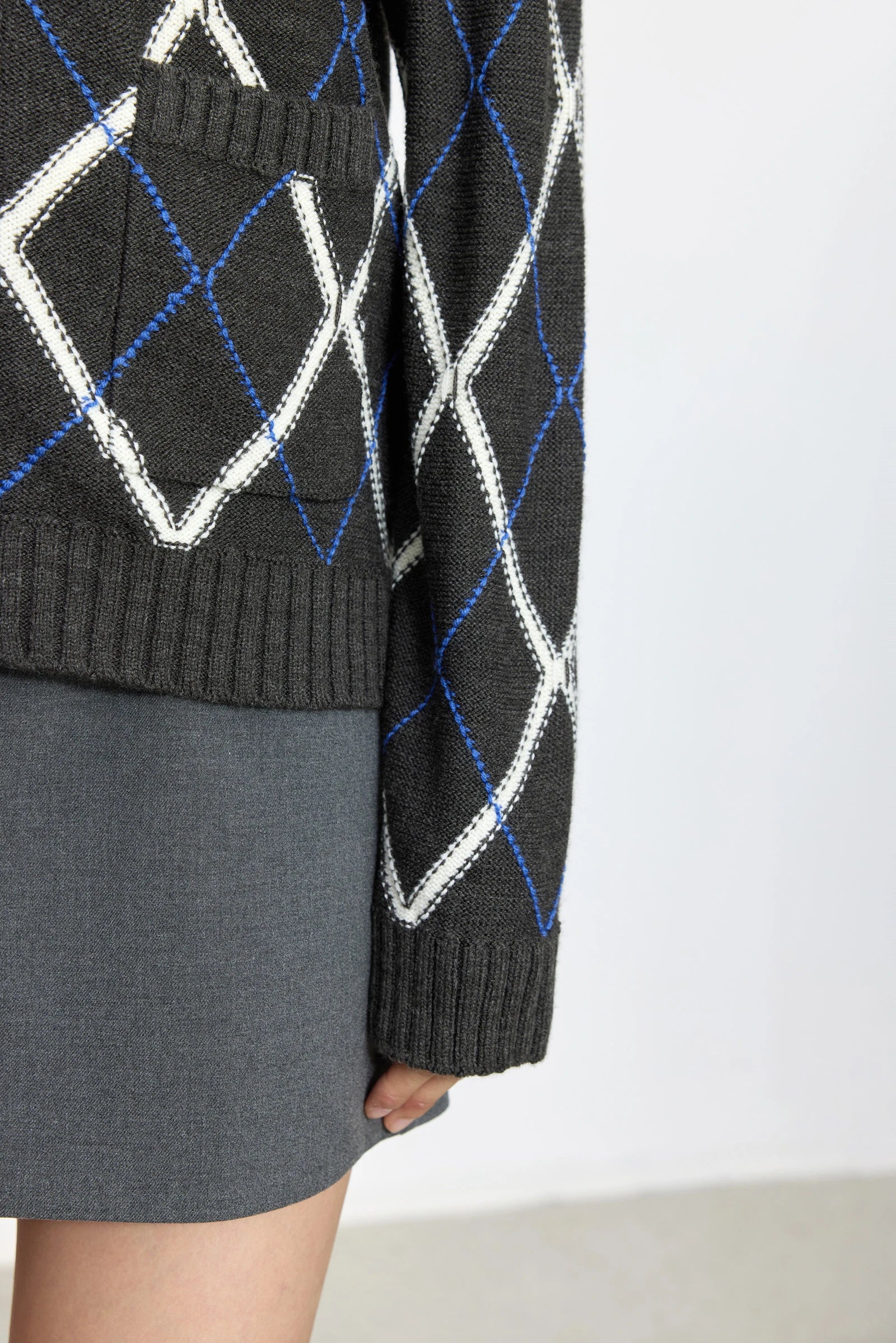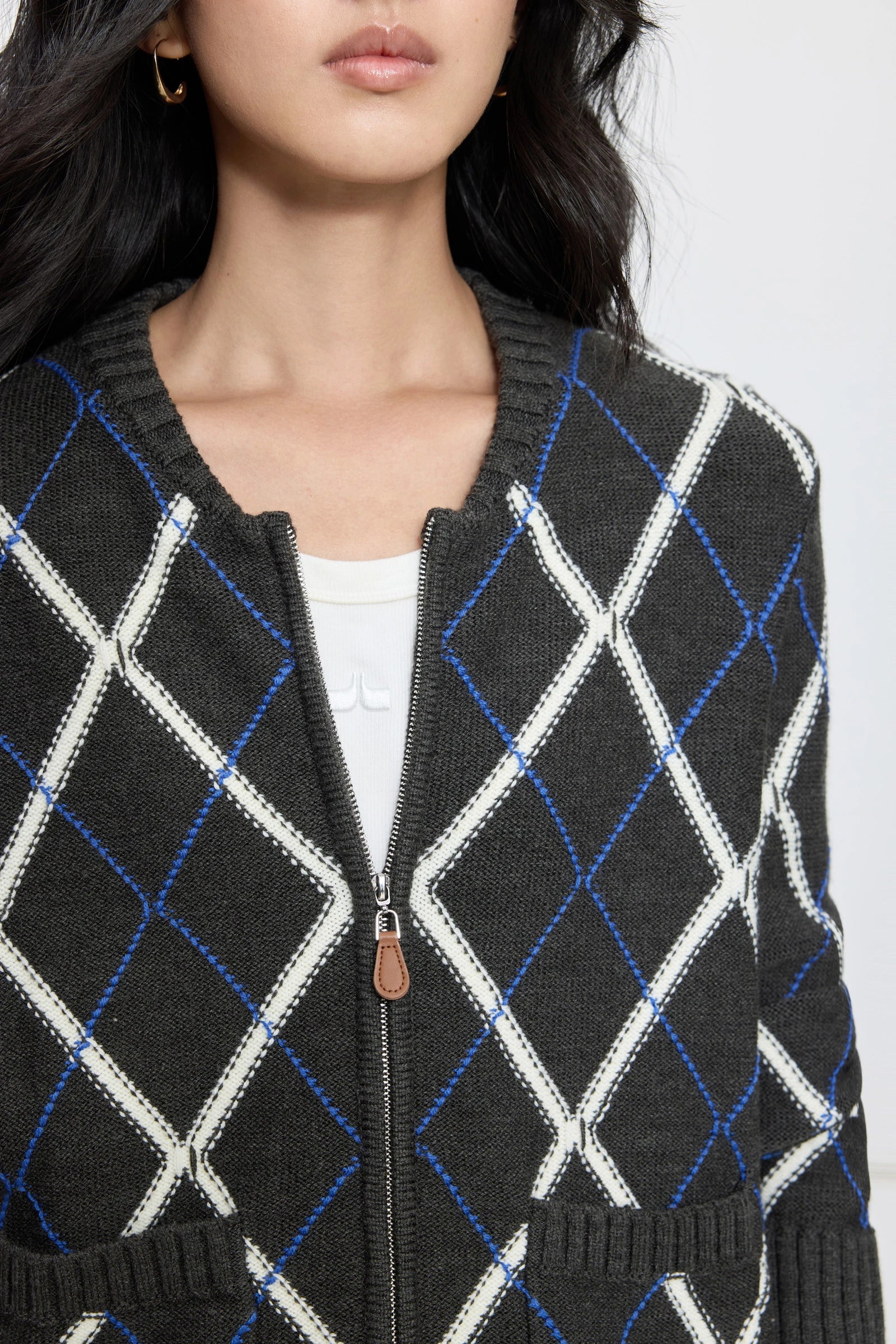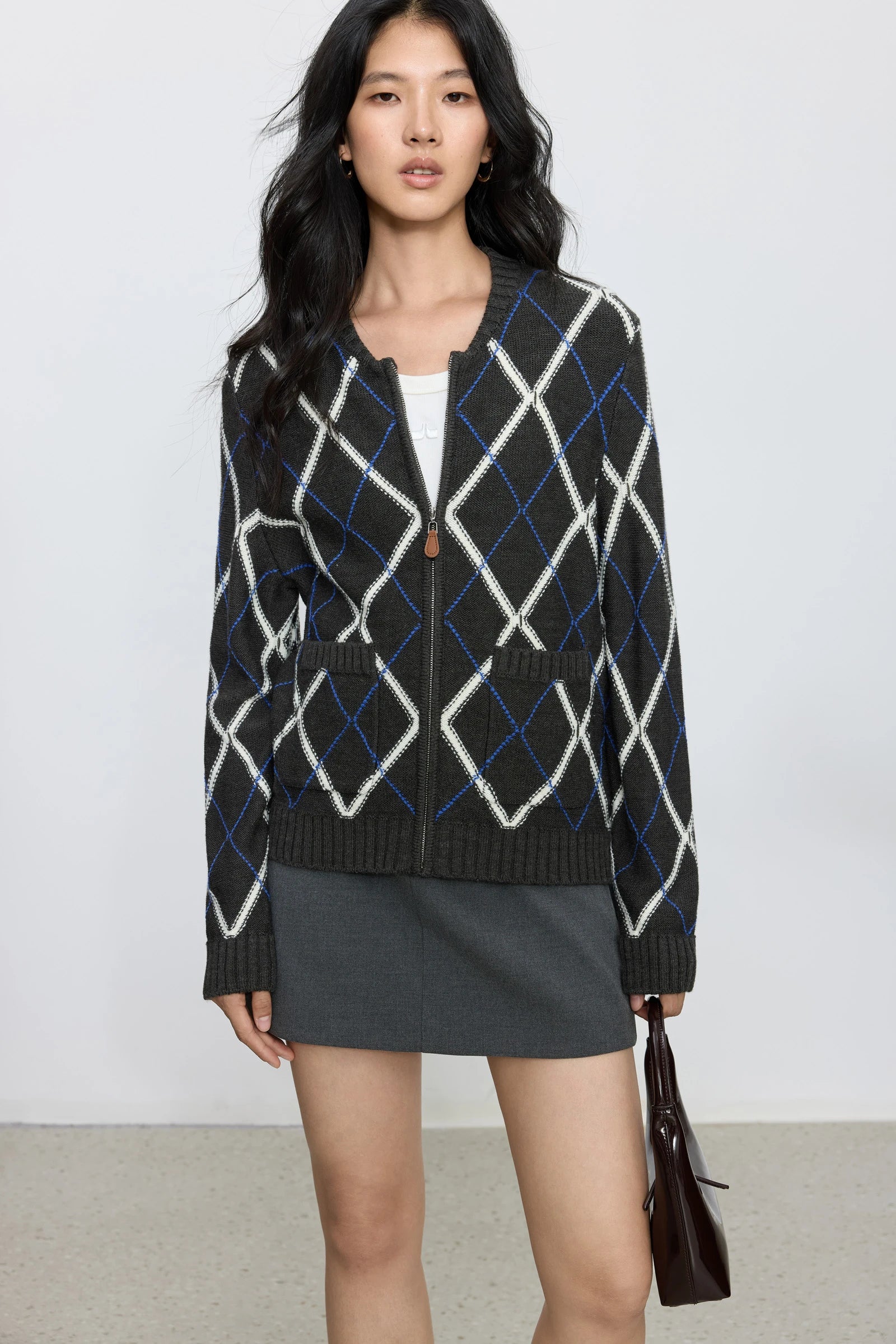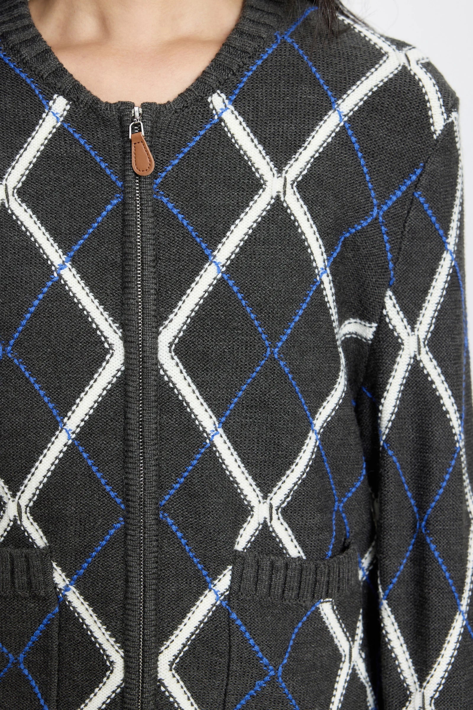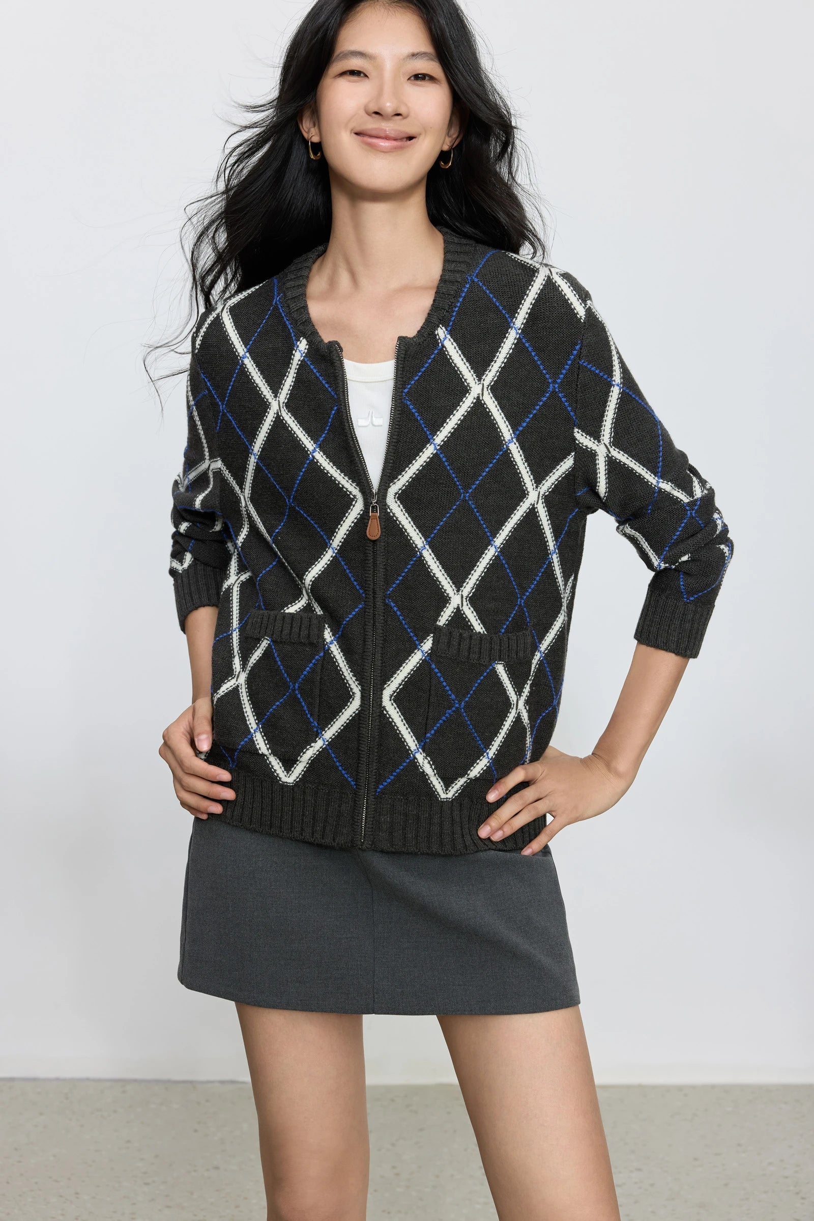 Fair Isle check, round neck zipper, patch pocket design, wool blend, urban commuting