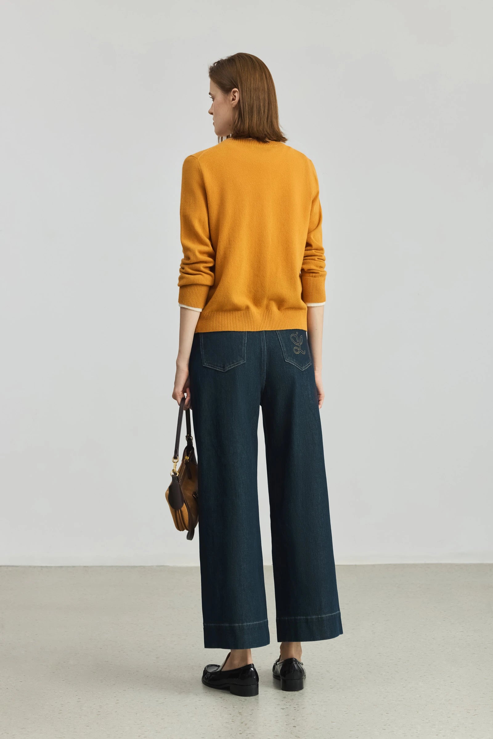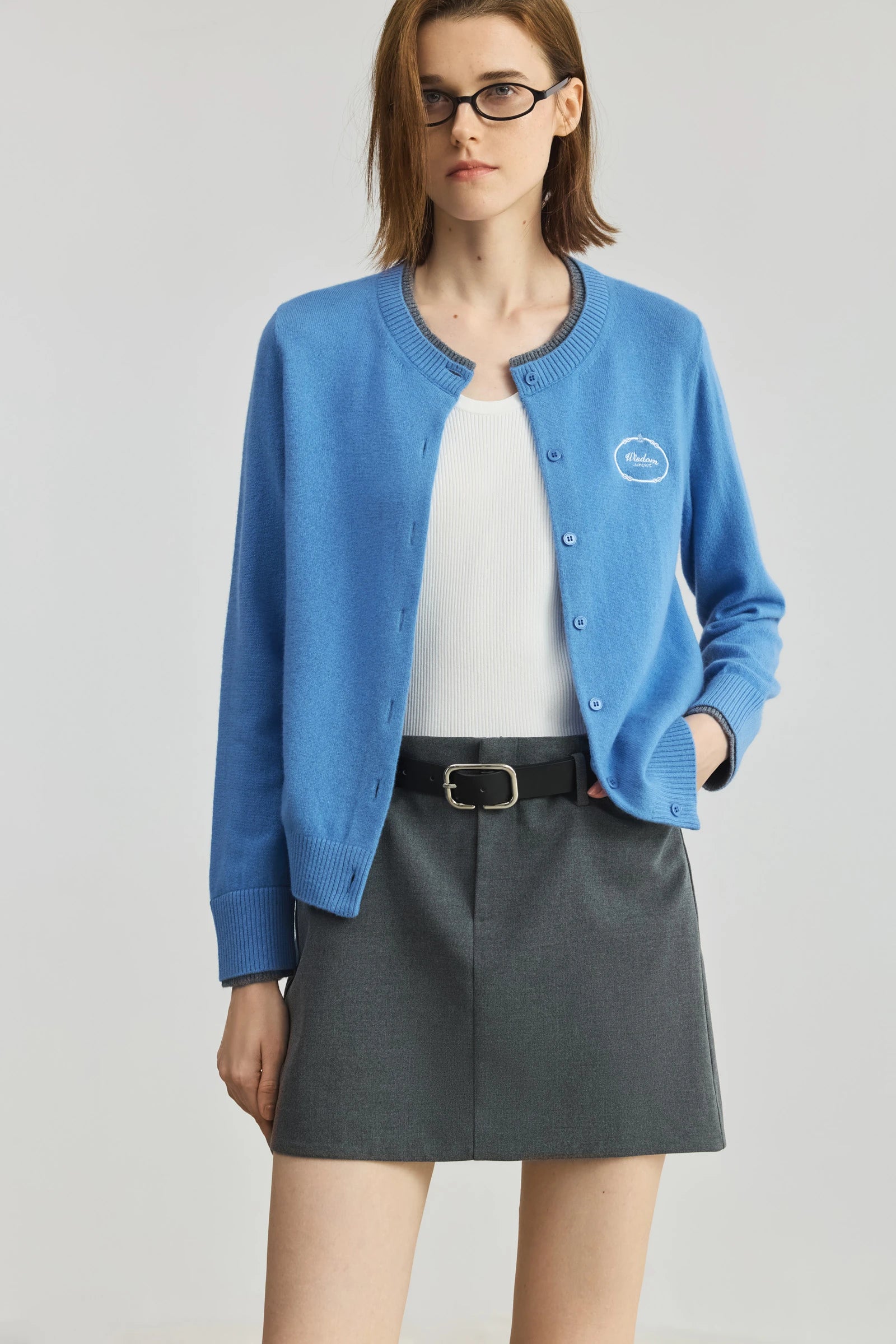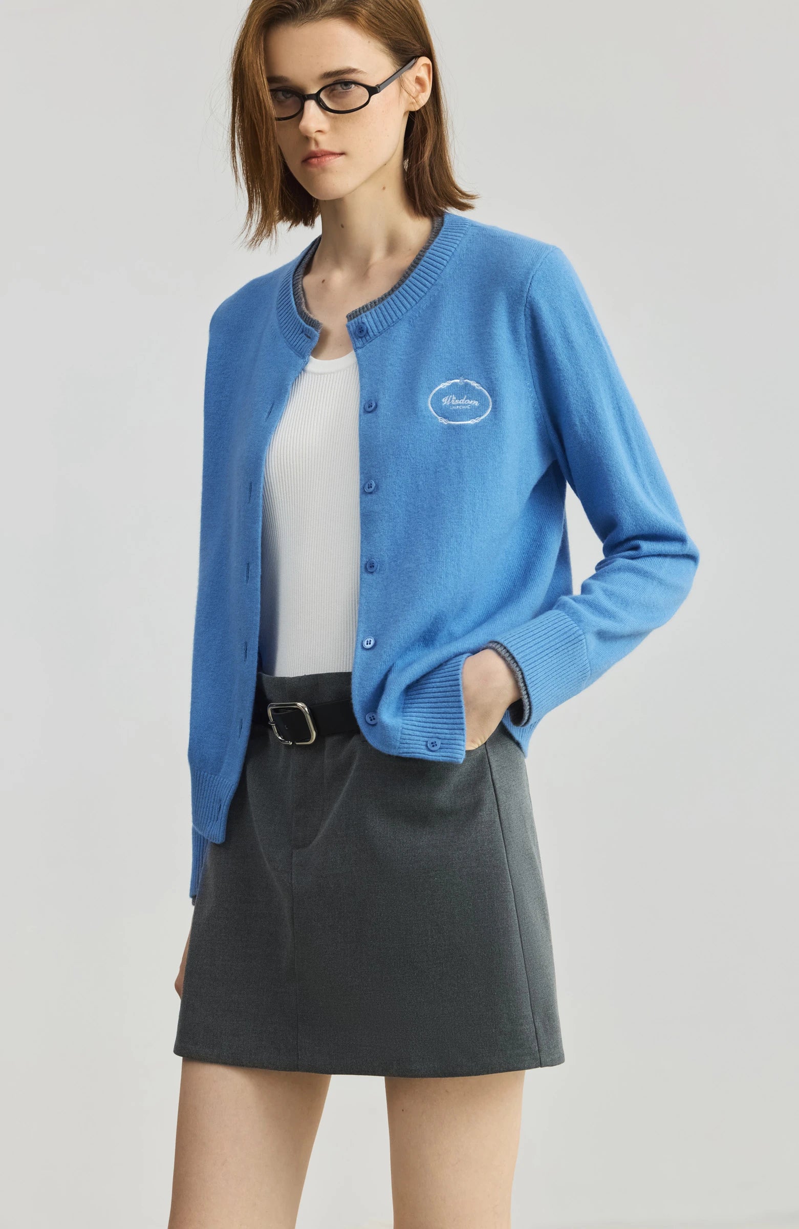 Contrast color design, preppy embroidery, cropped crew neck, Merino wool, preppy style